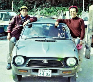2p愛媛県佐田岬半島正野港、保里会長の愛車と右 藤崎好夫さん 益田、保里、哲、藤崎好夫さん