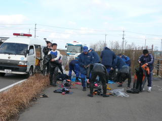 6p2001,2.若松脇ノ浦埋立地の事故現場、福岡県レスキュー隊がアクアスーツ着替え海に入ります